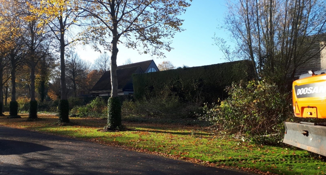 De beplanting van het bosplantsoen is inmiddels afgeknipt door middel van klepelmaaiers en kraan met vingerbalk. Met behulp van een bosfrees zijn alle wortels verpulverd. Daarna is door middel van frezen de grond bewerkt en klaargemaakt voor het inplanten van de beplanting.