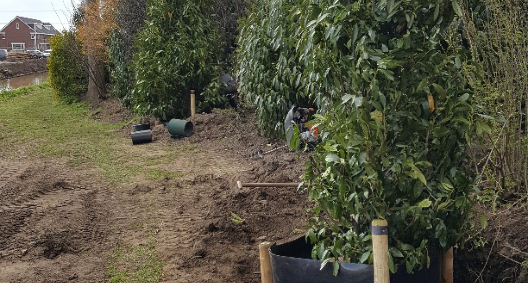 Er zijn onder andere 70 Prunus Laurocerasus Green Discovery geplant. Deze snelgroeiende Laurierkers heeft in het voorjaar mooie crèmewitte bloemen in opstaande trossen en blijft in de winter zijn glimmende donkergroene blad houden. Verder is hier ook een taxushaag neergezet om nog meer beslotenheid te creëren.