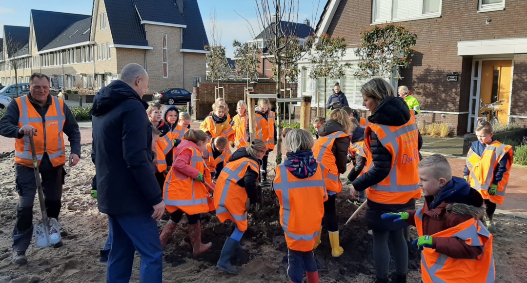 Na dagen van regen kwam op 4 maart dan toch de zon en dat kwam precies goed uit. Want onder het genot van dit zonnetje gingen de leerlingen van groep 5 van de Rehobothschool met veel enthousiasme aan de slag. Samen met wethouder Hordijk planten zij een aantal bomen in de straten rondom hun school in de wijk de Jonge Veenen. Dit gebeurde met begeleiding van medewerkers van Verheij die genoten van het plezier wat de kinderen hadden, want de kinderen vonden dit natuurlijk veel leuker dan een rekenles. Al werd er tijdens het planten toch nog flink gerekend, maar dat was dan vooral hoeveel bomen ze per groepje al hadden geplant. Daarnaast kwam biologie ook nog aan de orde, omdat er bij alle bomen een aantal wormen werden losgelaten. Deze wormen graven gangen in de grond, waardoor er meer zuurstof in de grond komt. Na afloop kregen de leerlingen als dank voor een hulp een tasje met wat lekkers en wat leuks.