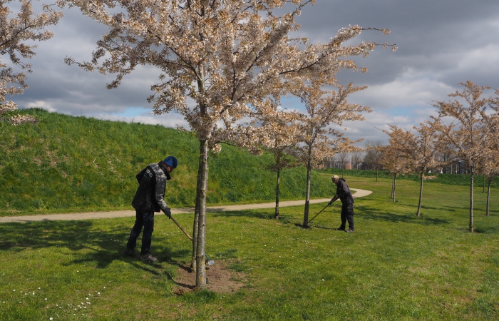 Zoals hier in de vesting, waar onder zonnige, maar ook koude omstandigheden bij diverse plantvakken en boomspiegels het …